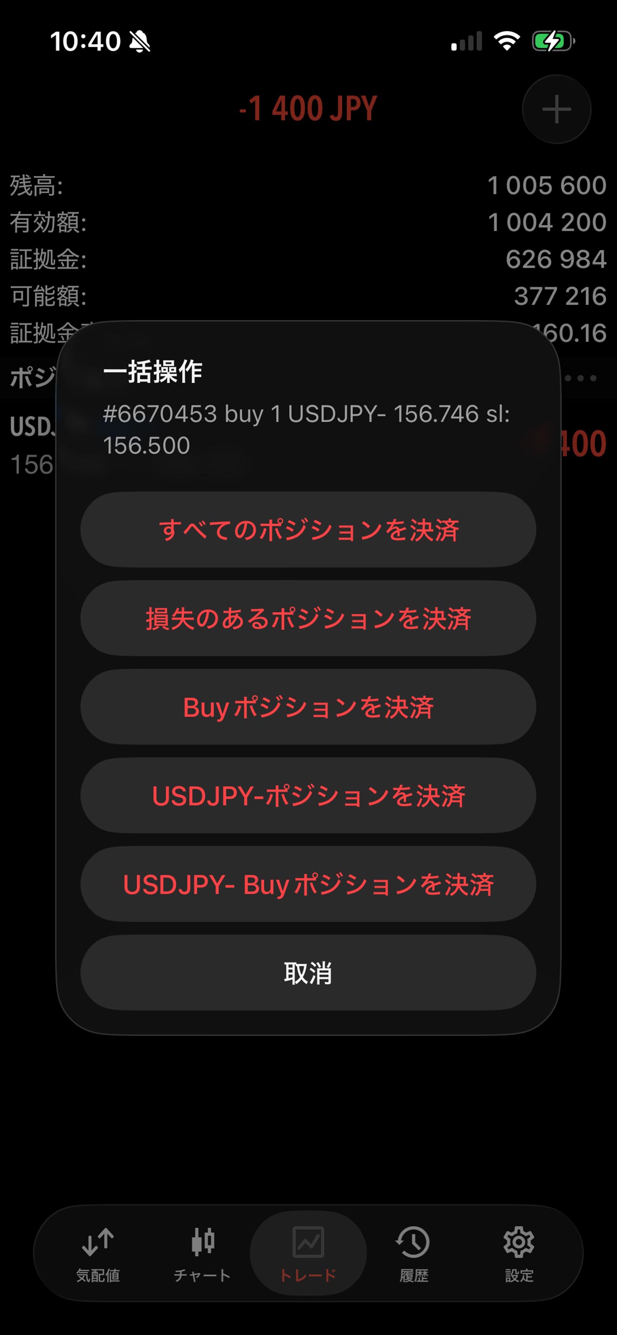ポジションの管理は「トレード」タブで。約定済みのトレード履歴は「履歴」で確認できます。