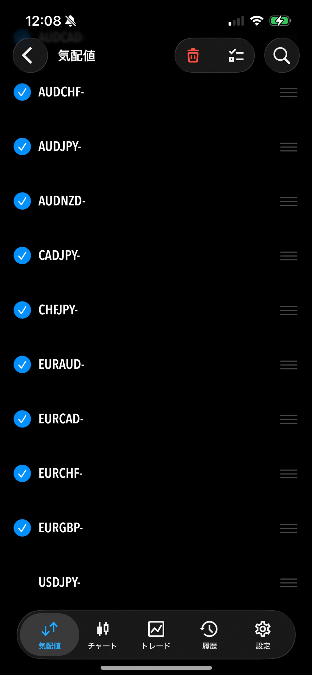 必要に応じて通貨ペアを増やしたり減らしたりする場合は、ペンアイコンをタップすると、通貨ペアを削除したり並べ替えをできる画面に遷移します。