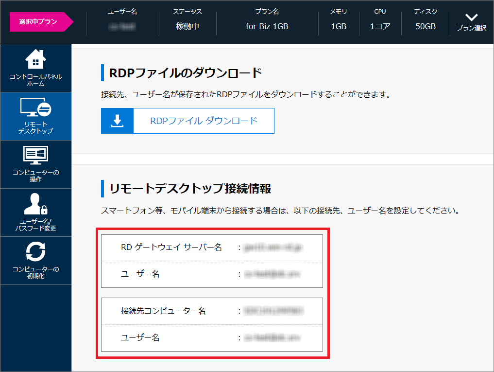 1コントロールパネルへログインし、コンピューターの一覧から接続情報を