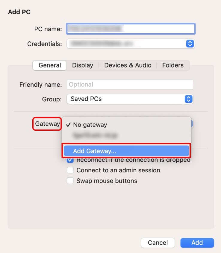 8「Add PC」画面に戻りましたら、「RDゲートウェイサーバー」の設定をします