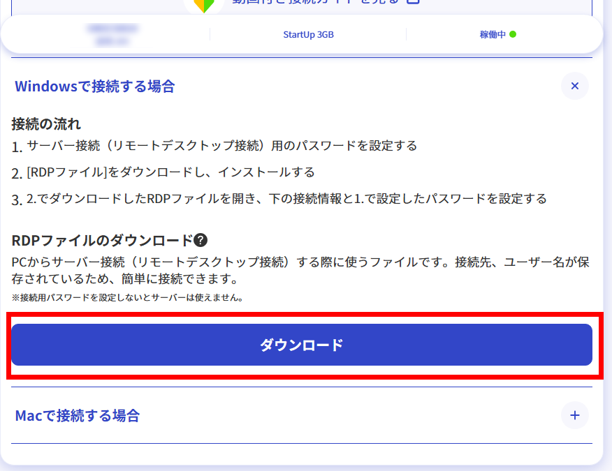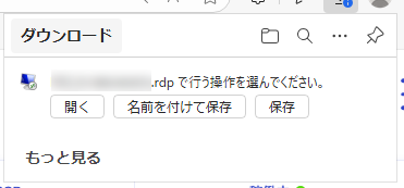 4「ダウンロード」をクリックすると、接続に必要な情報がRDPファイルとしてダウンロードされます。