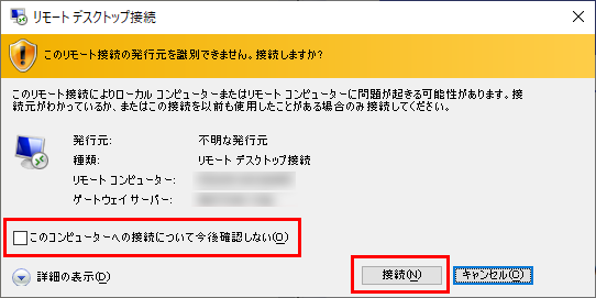 2「このリモート接続の発行元を識別できません。接続しますか?」と表示されます。